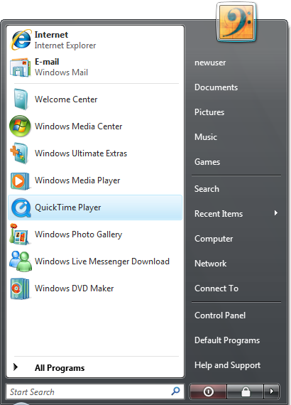 QuickTime appears on the Start Menu for all new users (at the highest position allowed by this method of configuration):